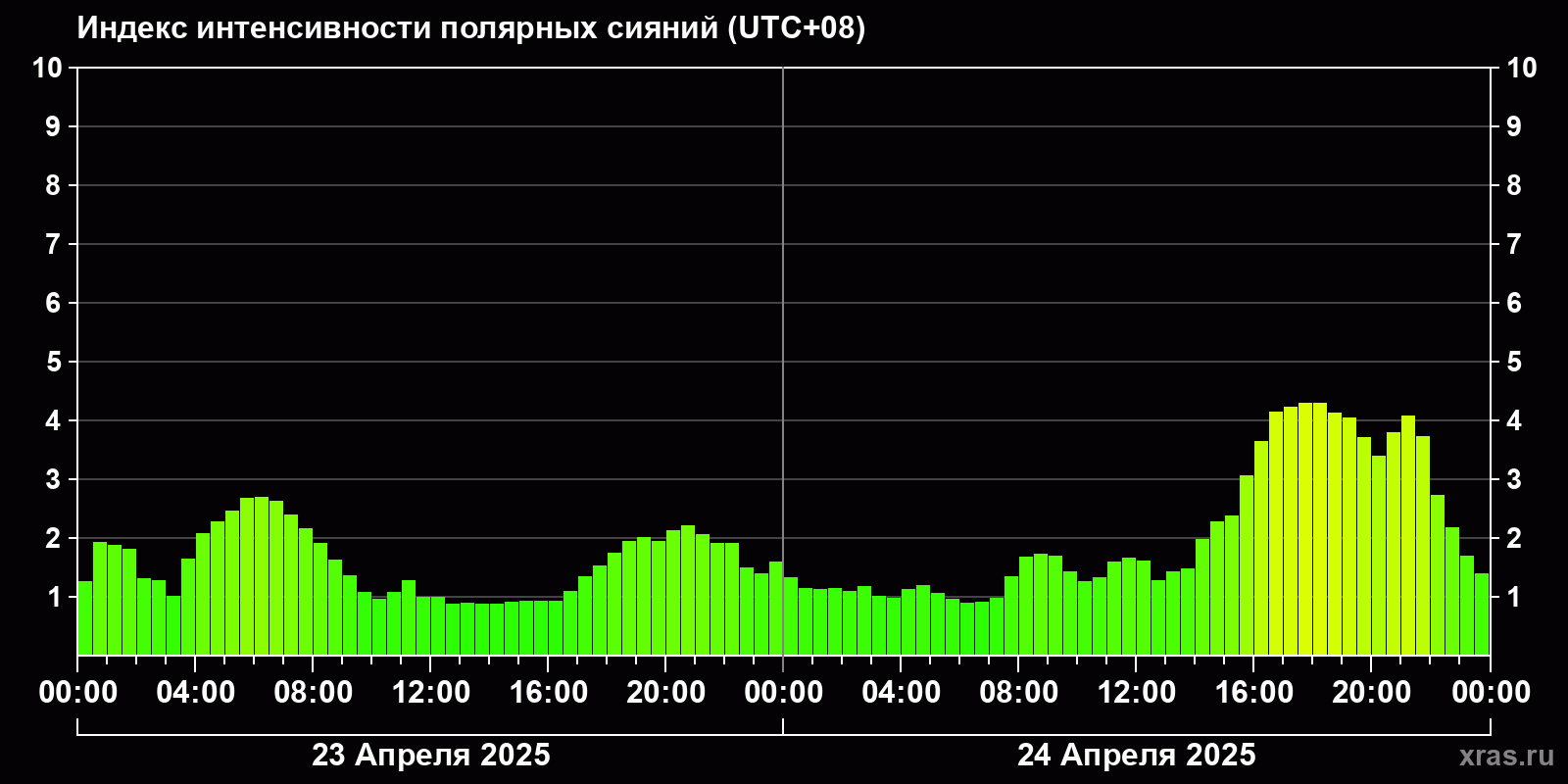 Изменения индекса интенсивности полярных сияний с 2025-04-23 по 2025-04-24 по местному времени