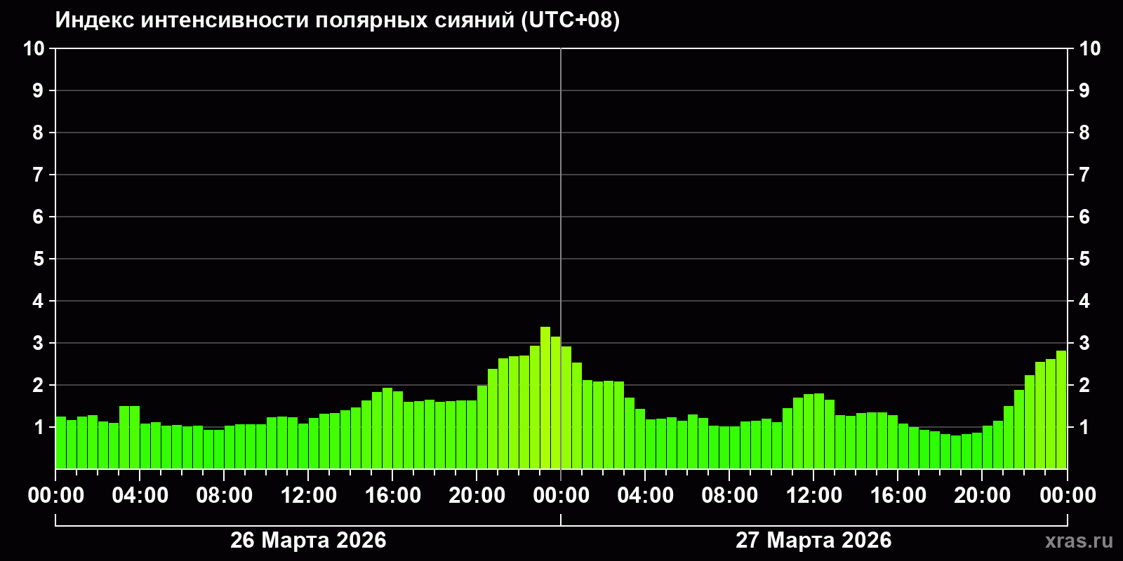 Изменения индекса интенсивности полярных сияний с 2026-03-26 по 2026-03-27 по местному времени