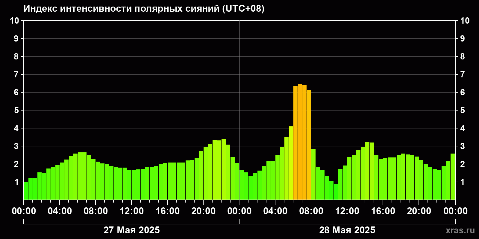 Изменения индекса интенсивности полярных сияний с 2025-05-27 по 2025-05-28 по местному времени