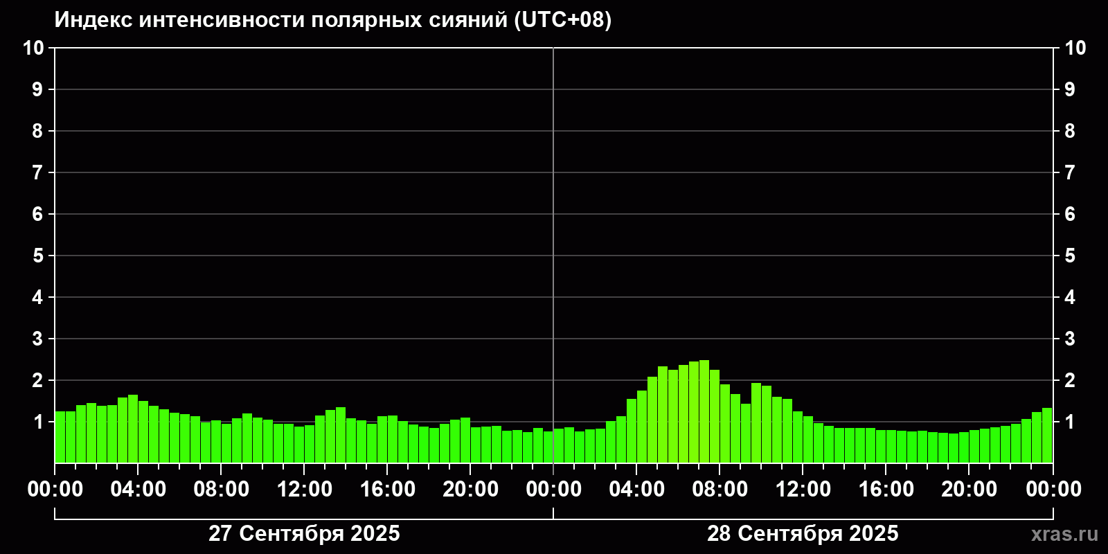 Изменения индекса интенсивности полярных сияний с 2025-09-27 по 2025-09-28 по местному времени