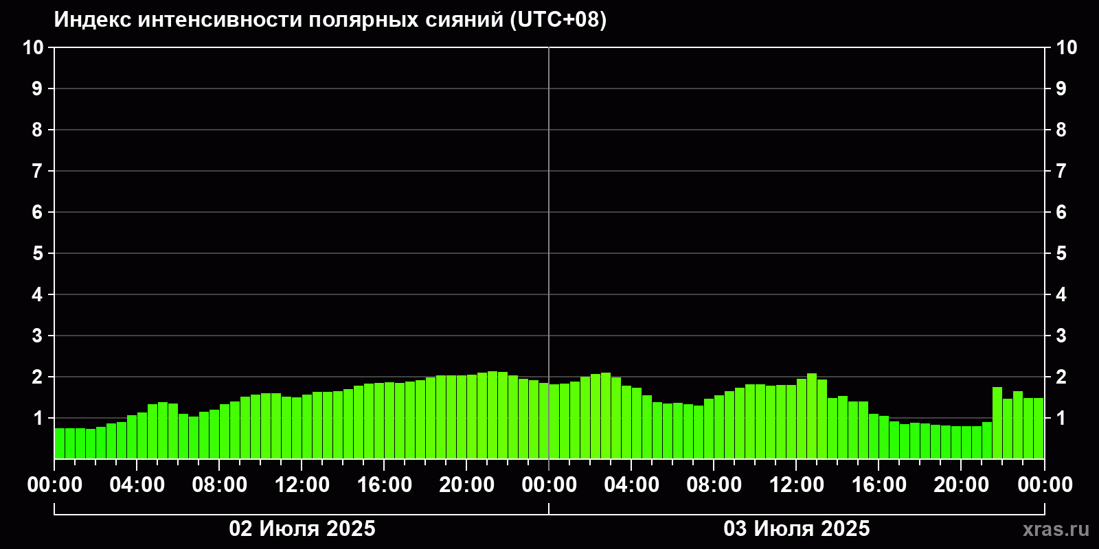 Изменения индекса интенсивности полярных сияний с 2025-07-02 по 2025-07-03 по местному времени