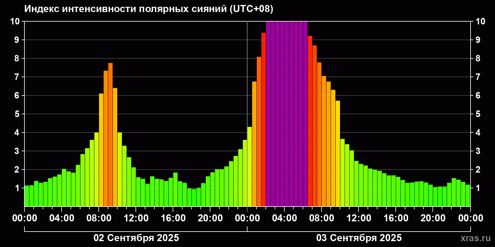 Изменения индекса интенсивности полярных сияний с 2025-09-02 по 2025-09-03 по местному времени