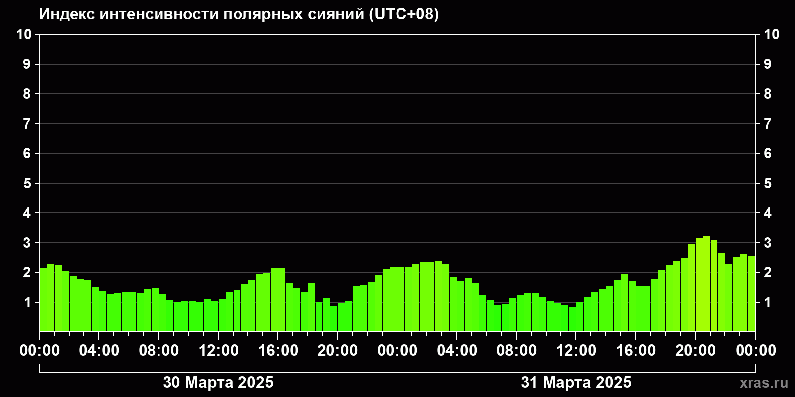 Изменения индекса интенсивности полярных сияний с 2025-03-30 по 2025-03-31 по местному времени