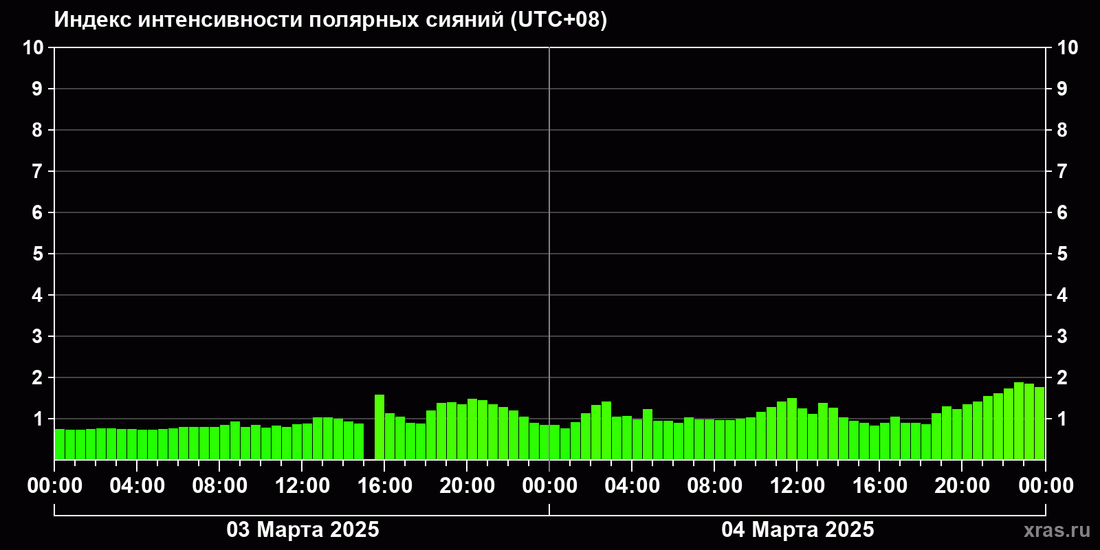 Изменения индекса интенсивности полярных сияний с 2025-03-03 по 2025-03-04 по местному времени