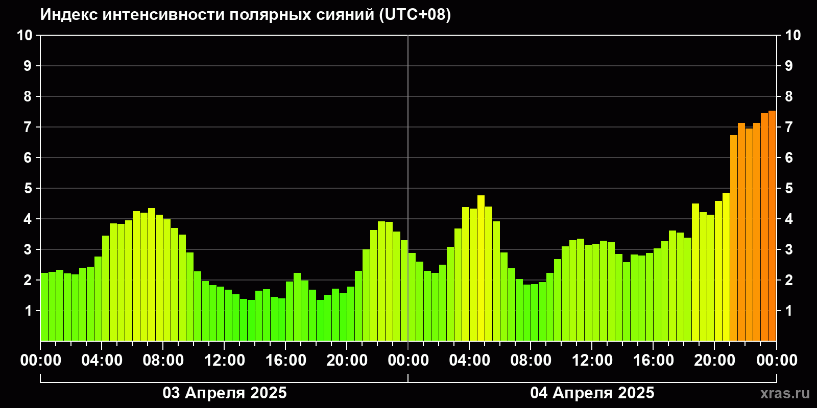 Изменения индекса интенсивности полярных сияний с 2025-04-03 по 2025-04-04 по местному времени
