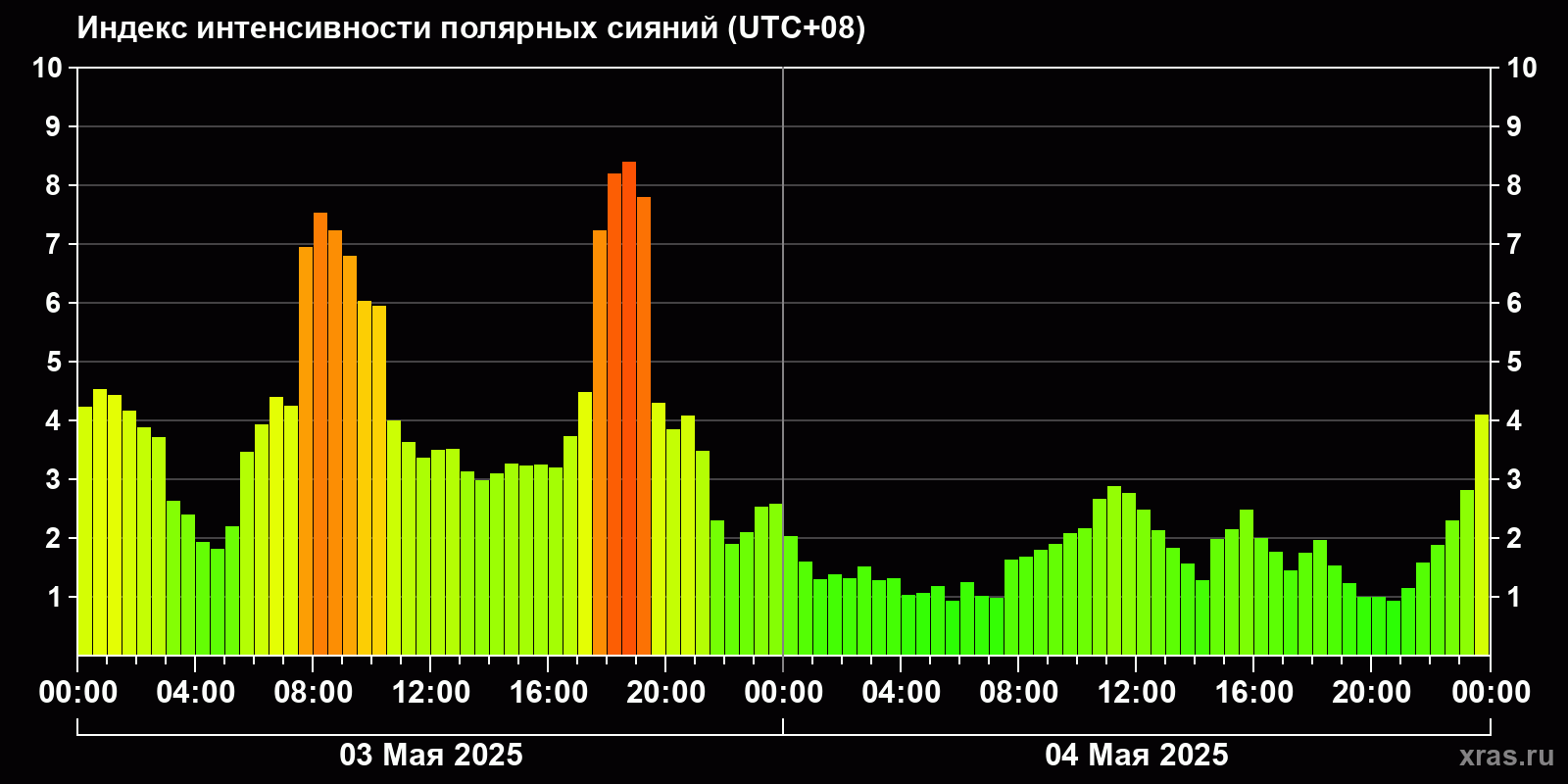 Изменения индекса интенсивности полярных сияний с 2025-05-03 по 2025-05-04 по местному времени