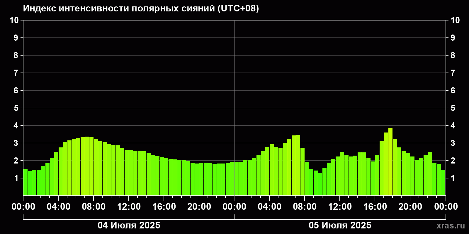 Изменения индекса интенсивности полярных сияний с 2025-07-04 по 2025-07-05 по местному времени