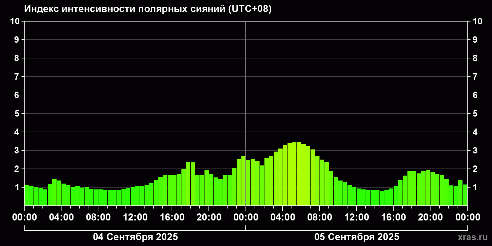 Изменения индекса интенсивности полярных сияний с 2025-09-04 по 2025-09-05 по местному времени