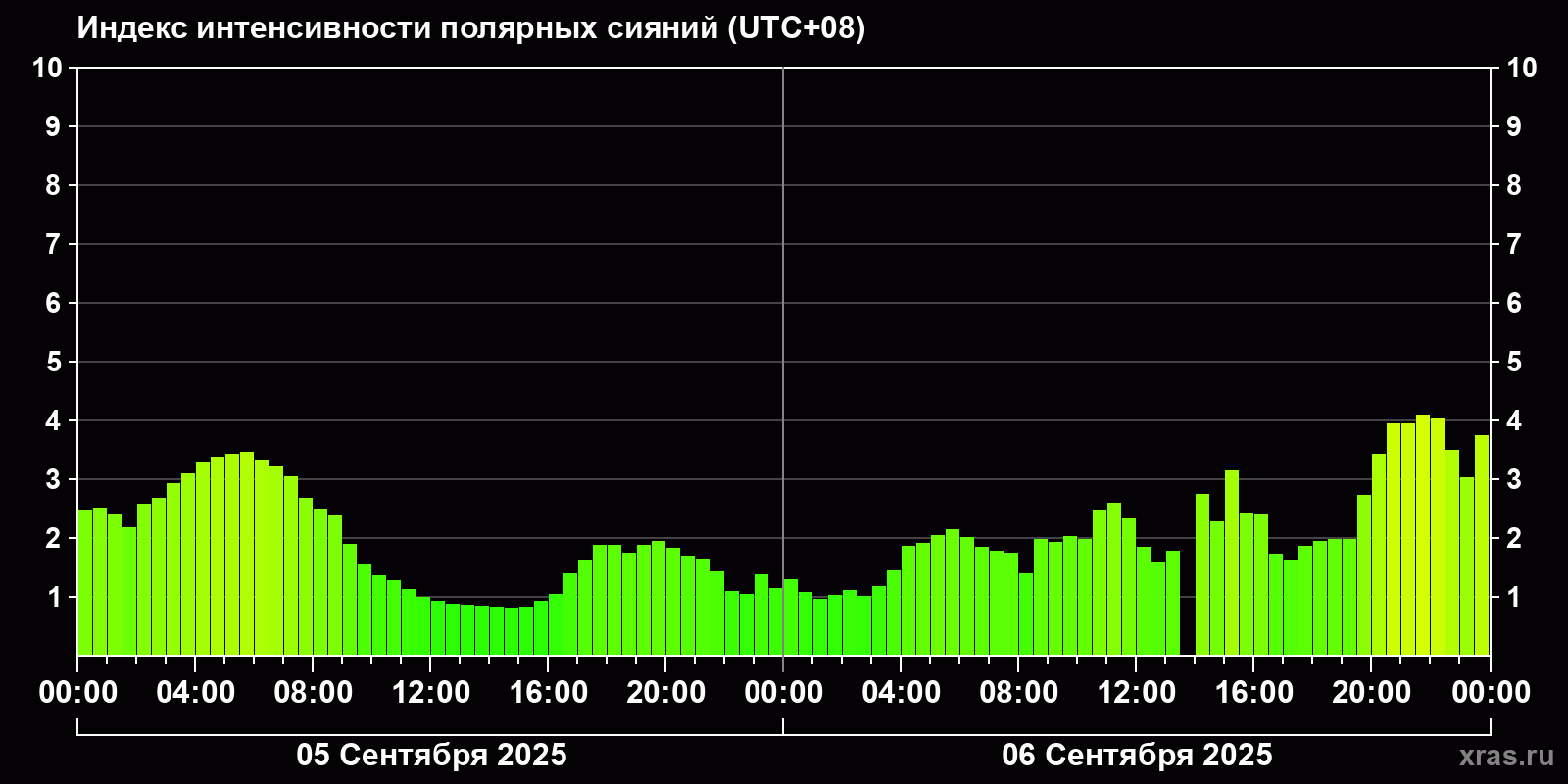 Изменения индекса интенсивности полярных сияний с 2025-09-05 по 2025-09-06 по местному времени