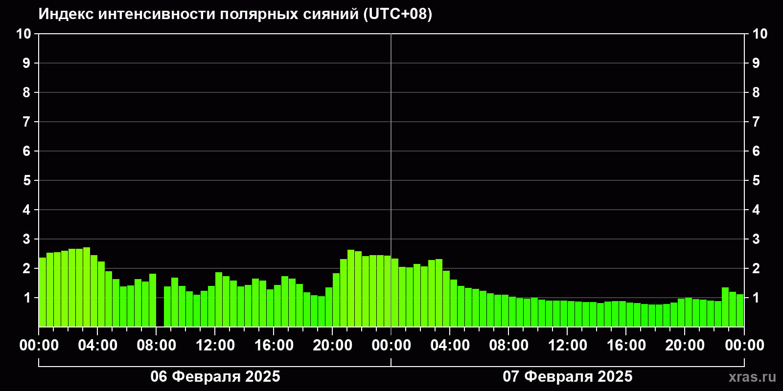 Изменения индекса интенсивности полярных сияний с 2025-02-06 по 2025-02-07 по местному времени