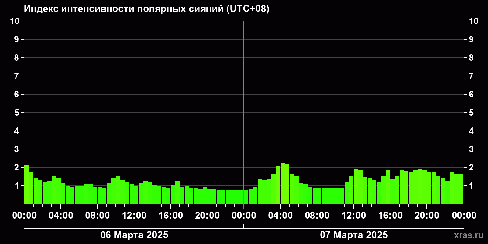 Изменения индекса интенсивности полярных сияний с 2025-03-06 по 2025-03-07 по местному времени