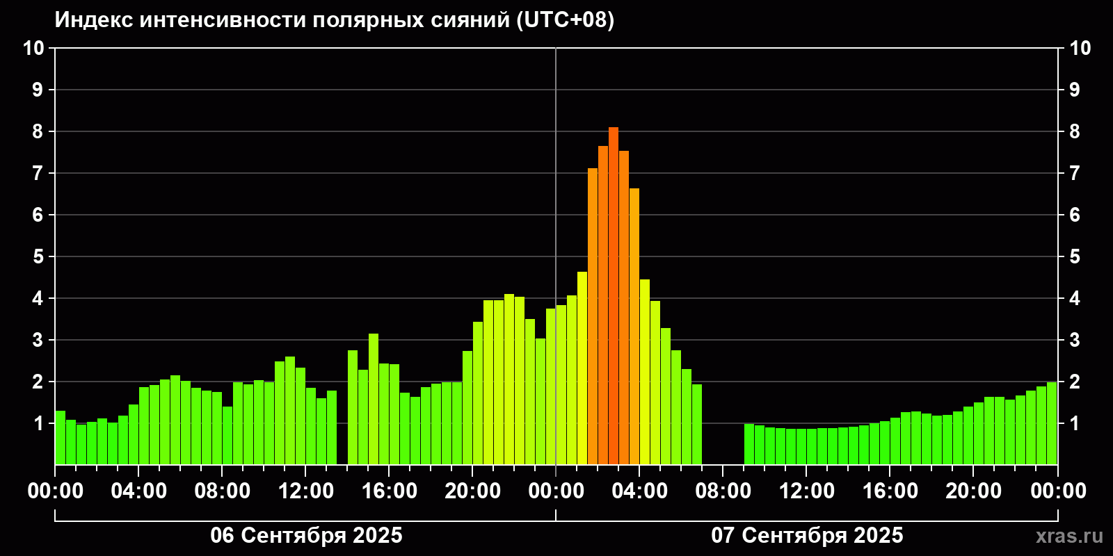 Изменения индекса интенсивности полярных сияний с 2025-09-06 по 2025-09-07 по местному времени