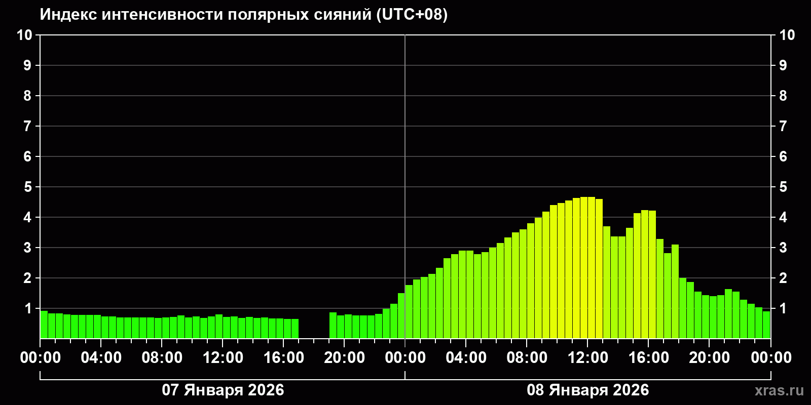 Изменения индекса интенсивности полярных сияний с 2026-01-07 по 2026-01-08 по местному времени