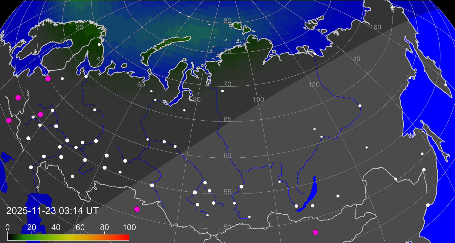Индекс интенсивности полярных сияний и теоретически возможная широта наблюдений для ночного времени в восточном полушарии