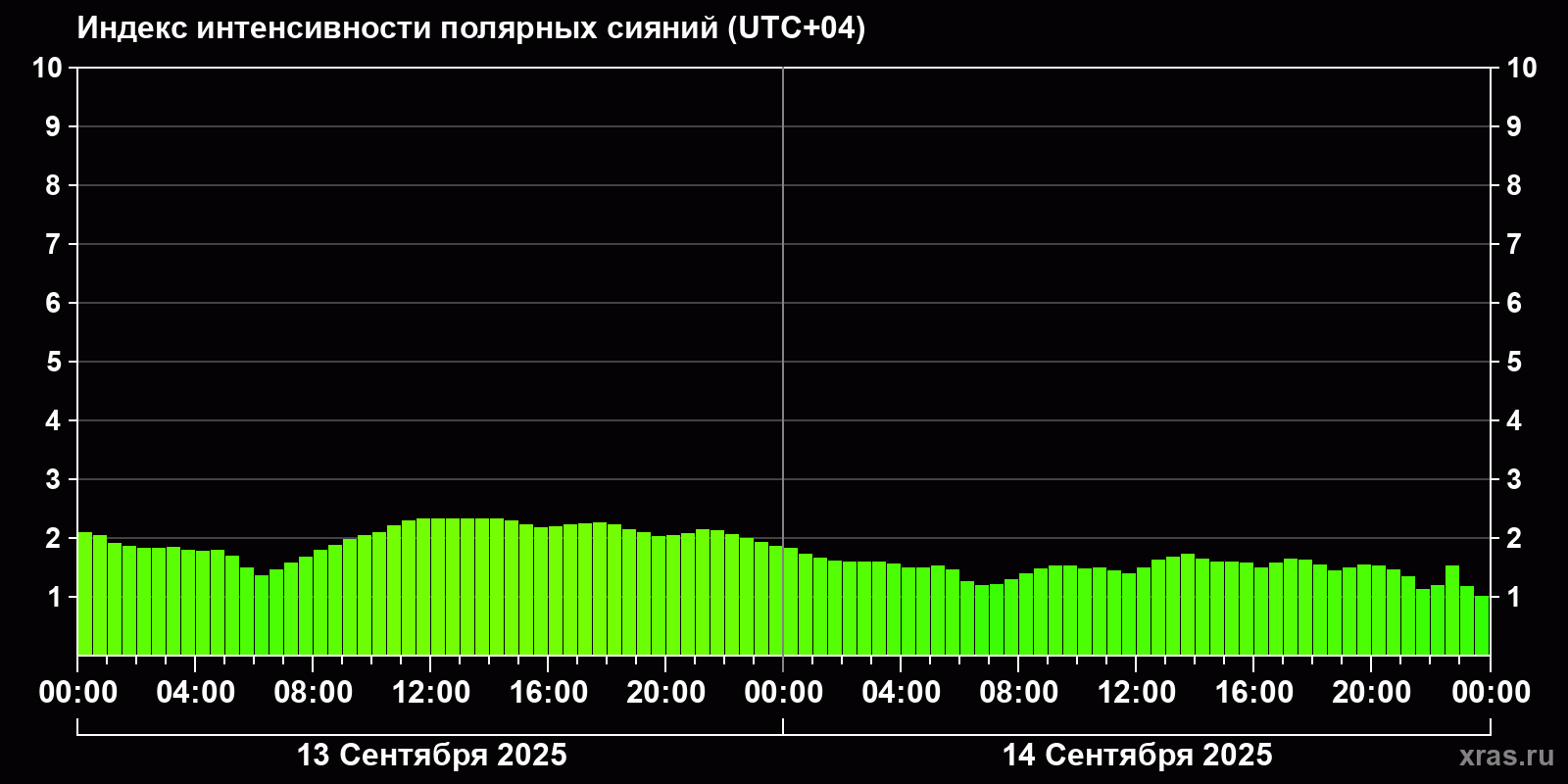 Изменения индекса интенсивности полярных сияний с 2025-09-13 по 2025-09-14 по местному времени