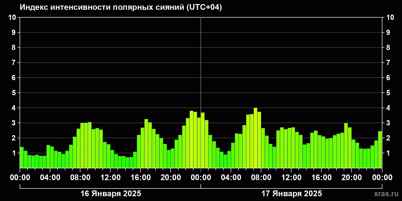 Изменения индекса интенсивности полярных сияний с 2025-01-16 по 2025-01-17 по местному времени