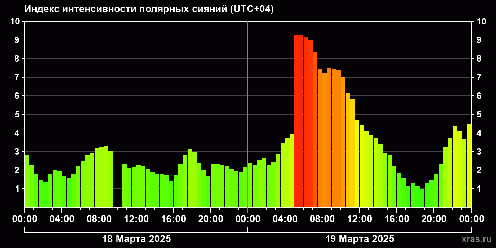 Изменения индекса интенсивности полярных сияний с 2025-03-18 по 2025-03-19 по местному времени