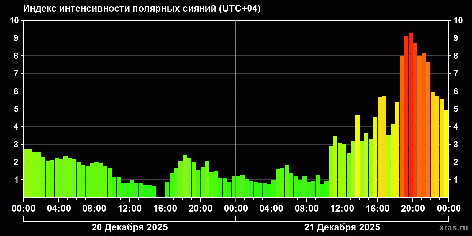 Изменения индекса интенсивности полярных сияний с 2025-12-20 по 2025-12-21 по местному времени