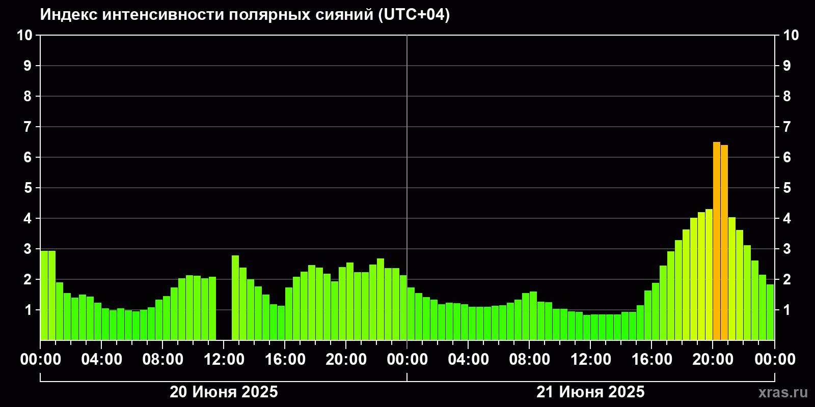 Изменения индекса интенсивности полярных сияний с 2025-06-20 по 2025-06-21 по местному времени