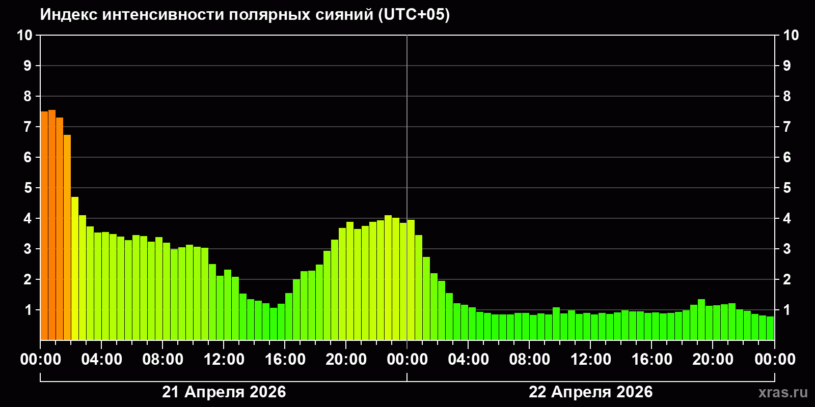 Изменения индекса интенсивности полярных сияний с 2026-04-21 по 2026-04-22 по местному времени