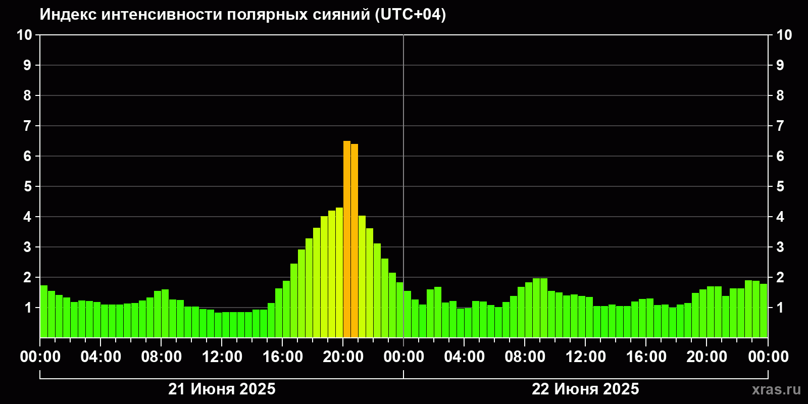Изменения индекса интенсивности полярных сияний с 2025-06-21 по 2025-06-22 по местному времени