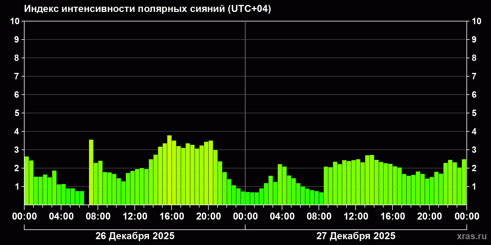 Изменения индекса интенсивности полярных сияний с 2025-12-26 по 2025-12-27 по местному времени