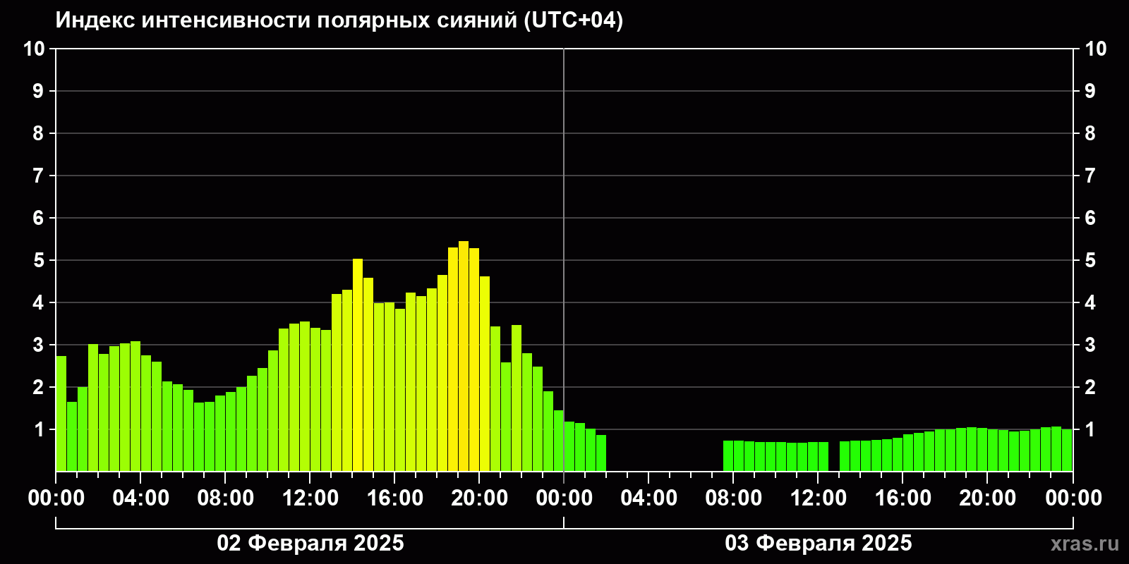 Изменения индекса интенсивности полярных сияний с 2025-02-02 по 2025-02-03 по местному времени