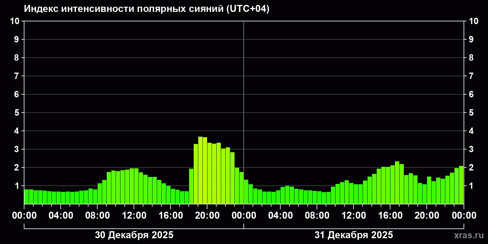 Изменения индекса интенсивности полярных сияний с 2025-12-30 по 2025-12-31 по местному времени