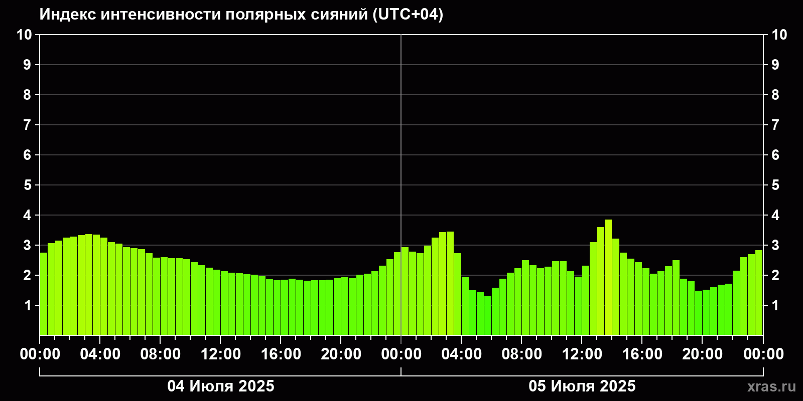 Изменения индекса интенсивности полярных сияний с 2025-07-04 по 2025-07-05 по местному времени