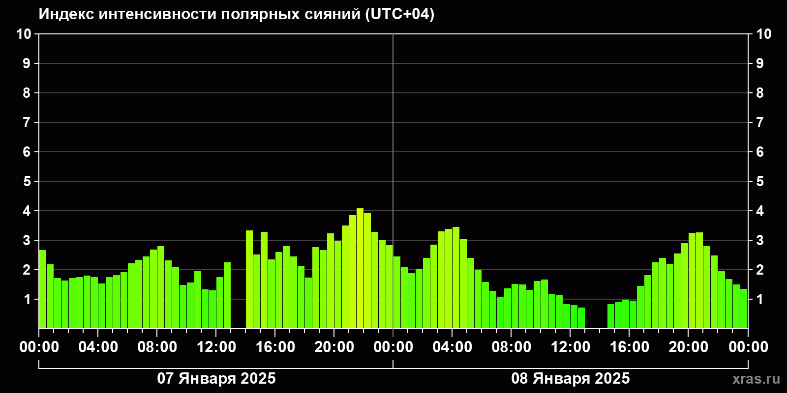 Изменения индекса интенсивности полярных сияний с 2025-01-07 по 2025-01-08 по местному времени