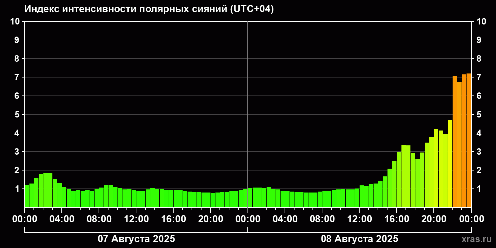Изменения индекса интенсивности полярных сияний с 2025-08-07 по 2025-08-08 по местному времени