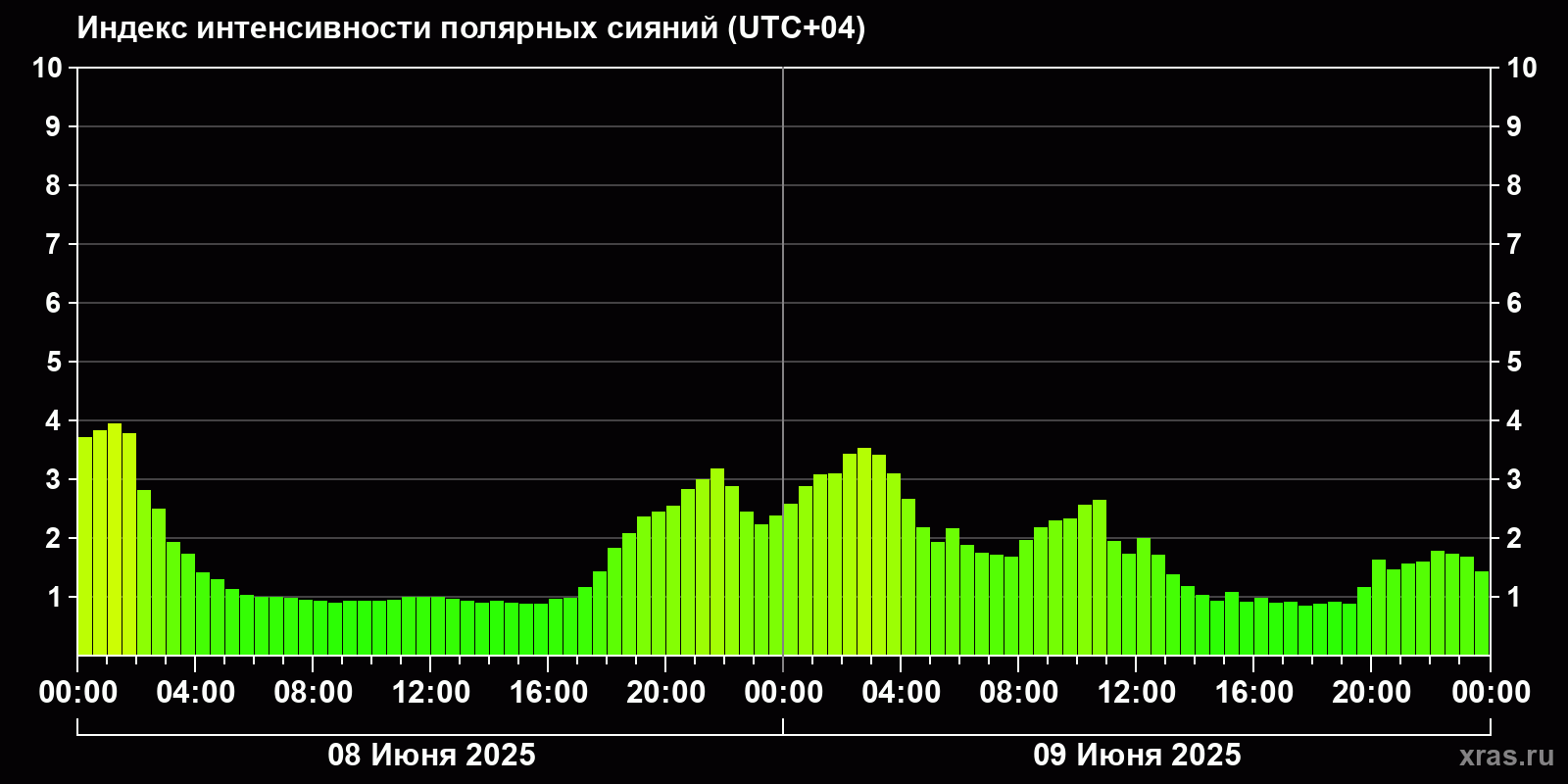 Изменения индекса интенсивности полярных сияний с 2025-06-08 по 2025-06-09 по местному времени
