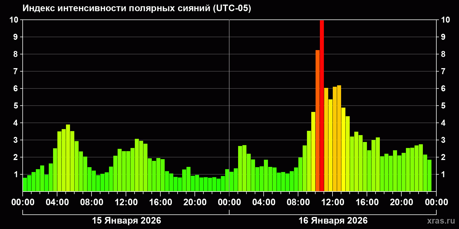 Изменения индекса интенсивности полярных сияний с 2026-01-15 по 2026-01-16 по местному времени