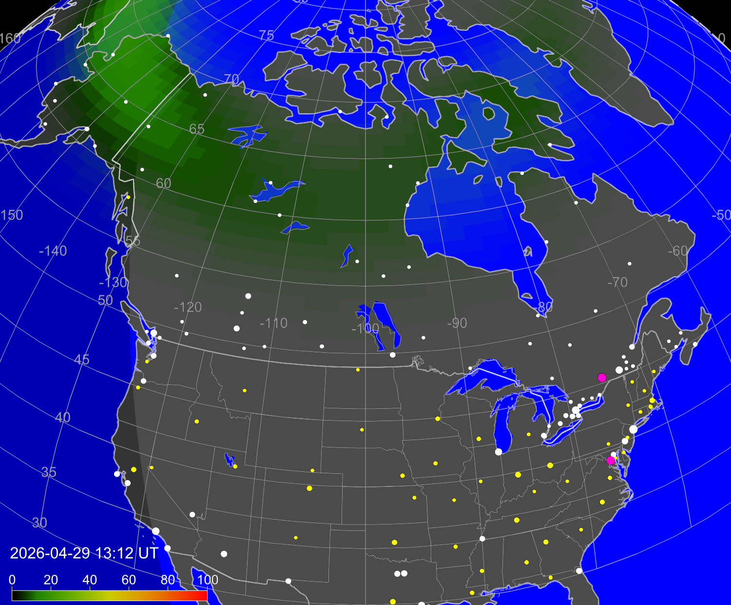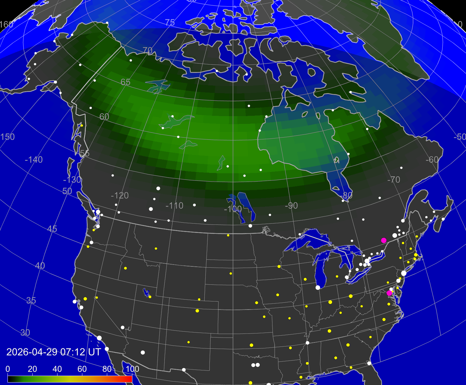 Вероятность полярных сияний в городах США