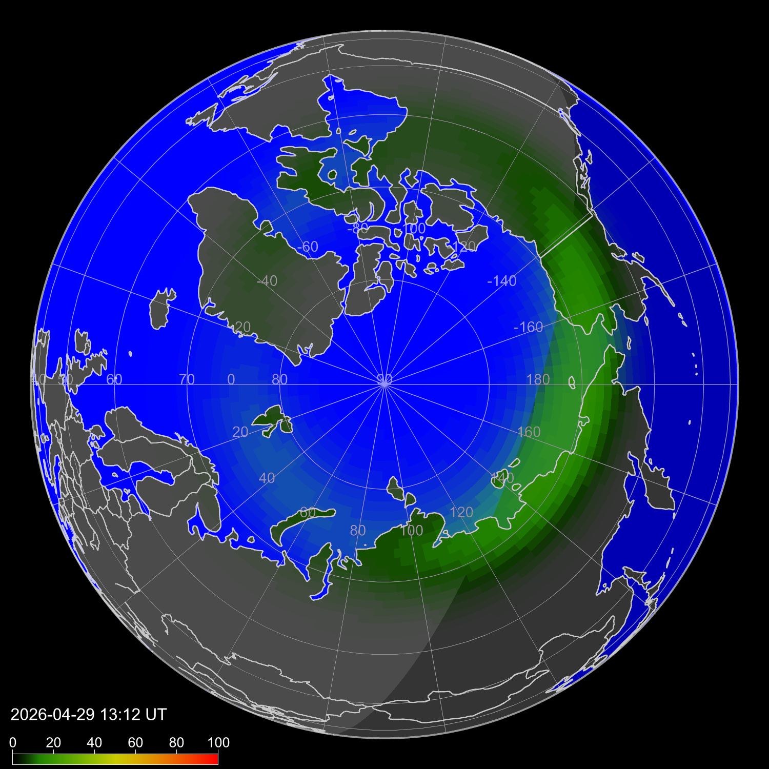 Индекс интенсивности полярных сияний и теоретически возможная широта наблюдений для ночного времени в западном полушарии