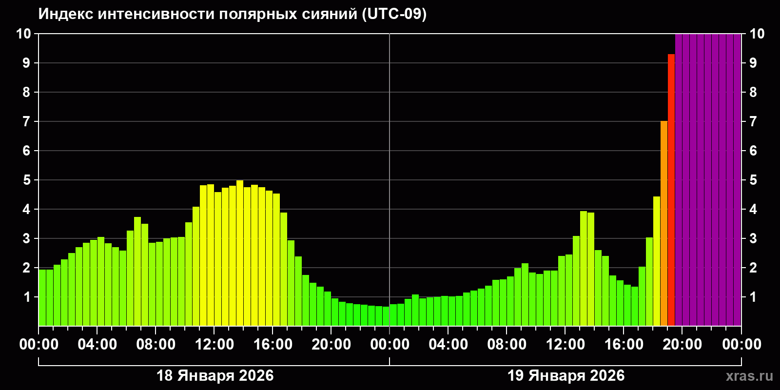 Изменения индекса интенсивности полярных сияний с 2026-01-18 по 2026-01-19 по местному времени