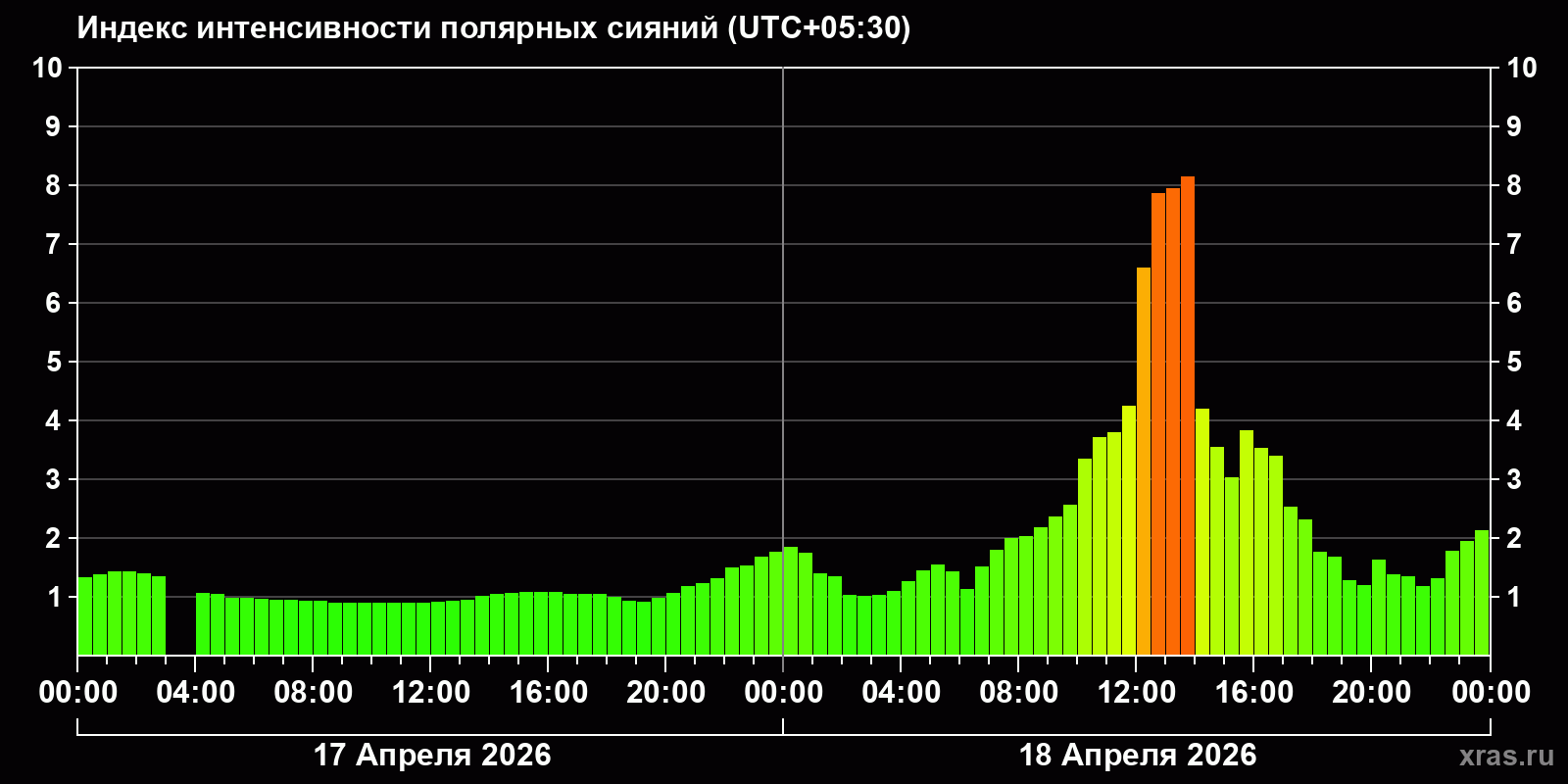 Изменения индекса интенсивности полярных сияний с 2026-04-17 по 2026-04-18 по местному времени