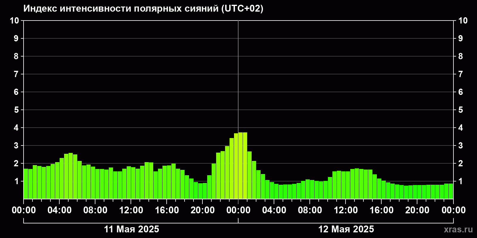 Изменения индекса интенсивности полярных сияний с 2025-05-11 по 2025-05-12 по местному времени