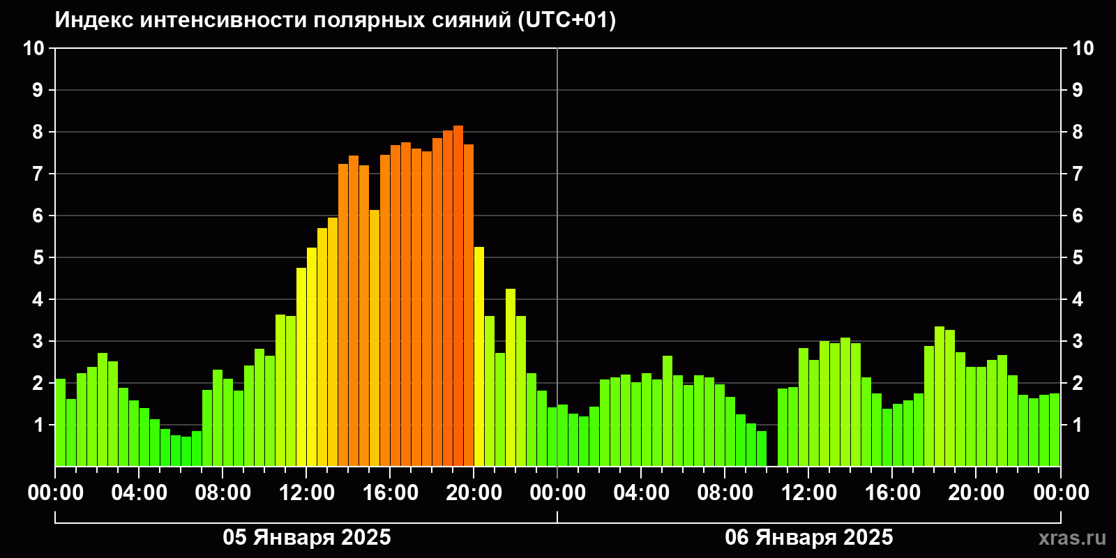 Изменения индекса интенсивности полярных сияний с 2025-01-05 по 2025-01-06 по местному времени