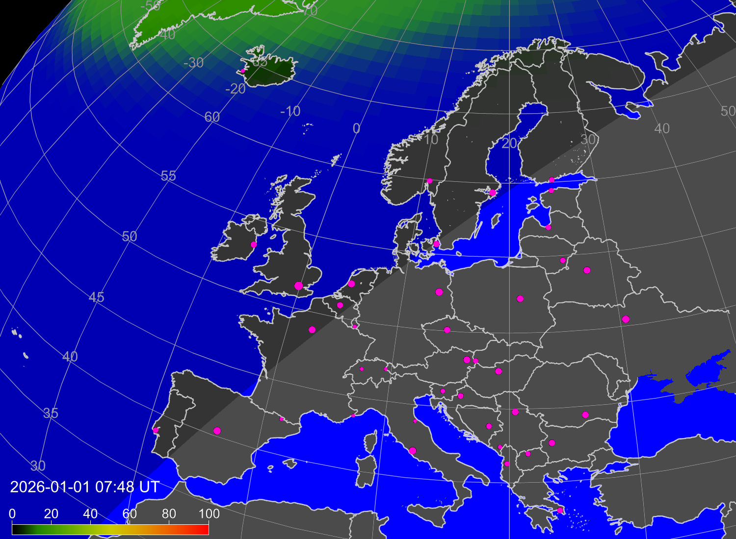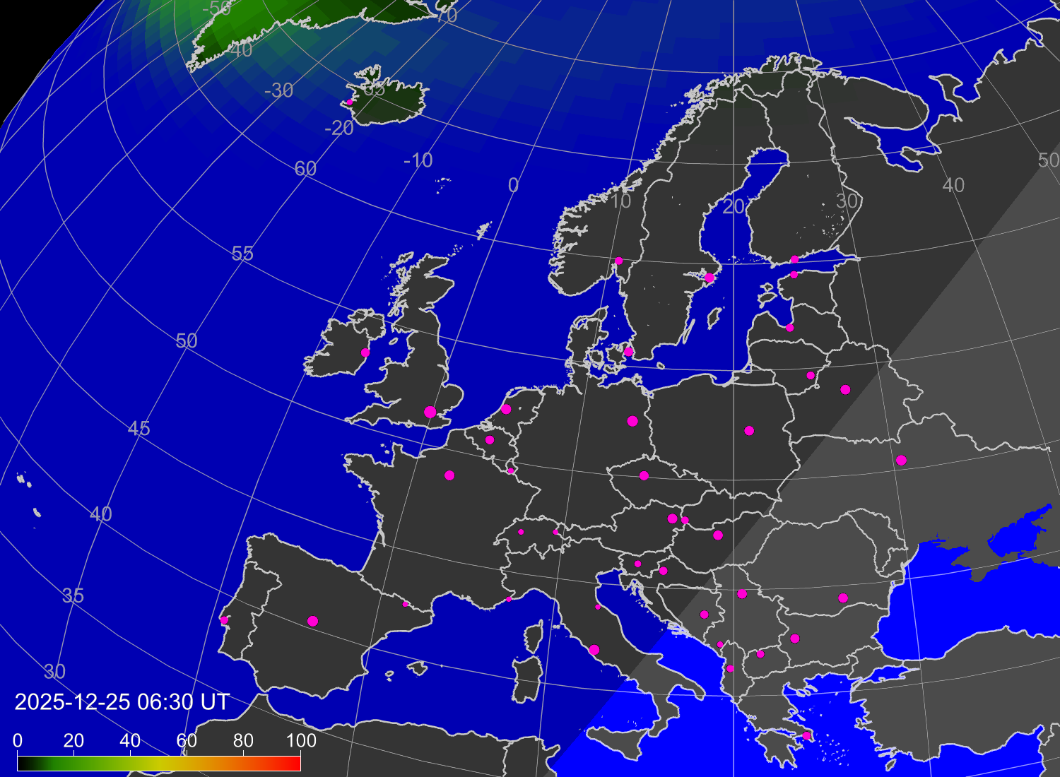 Индекс интенсивности полярных сияний и теоретически возможная широта наблюдений для ночного времени в восточном полушарии