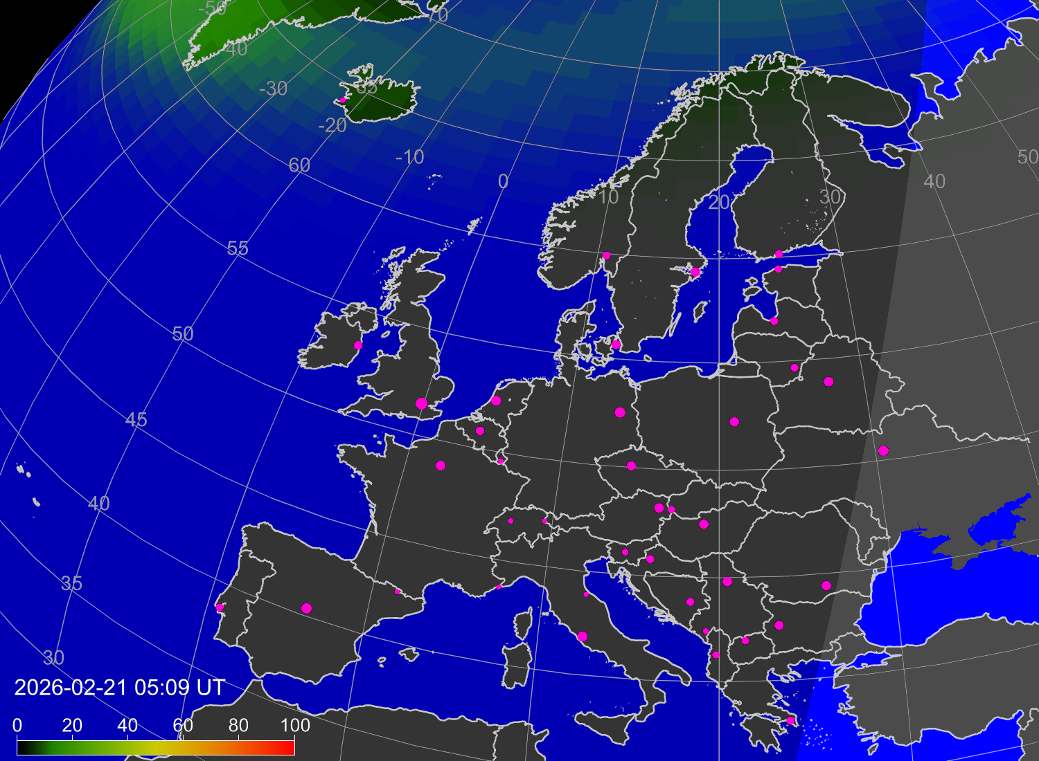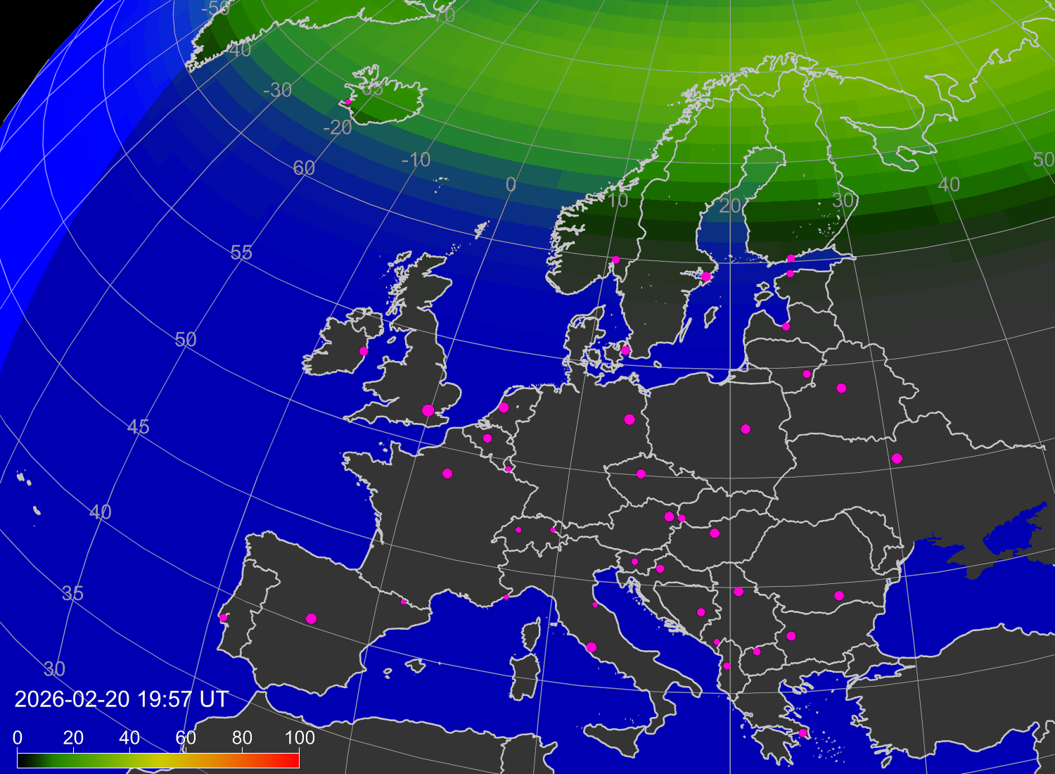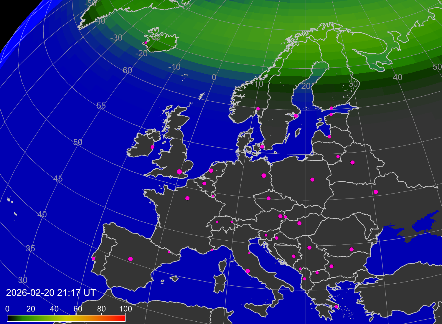 Вероятность полярных сияний в городах Европы
