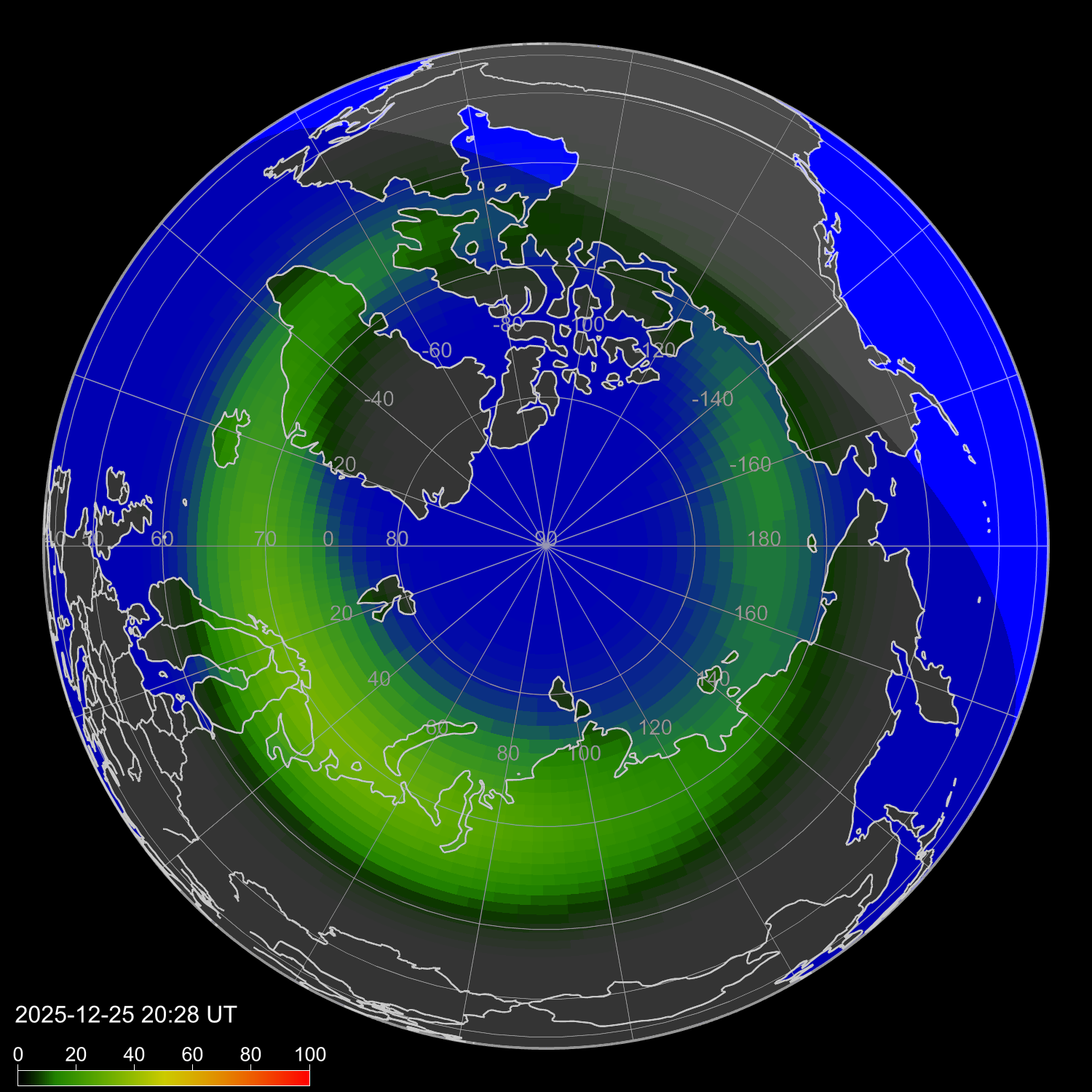 Изменения и часовой прогноз индекса интенсивности полярных сияний с 2025-12-23 по 2025-12-24
