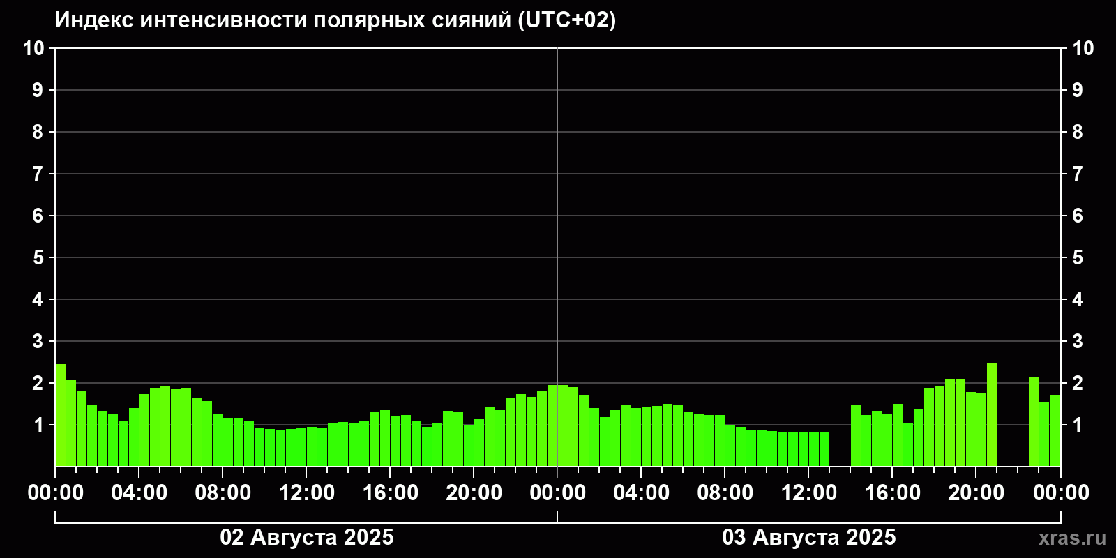 Изменения индекса интенсивности полярных сияний с 2025-08-02 по 2025-08-03 по местному времени