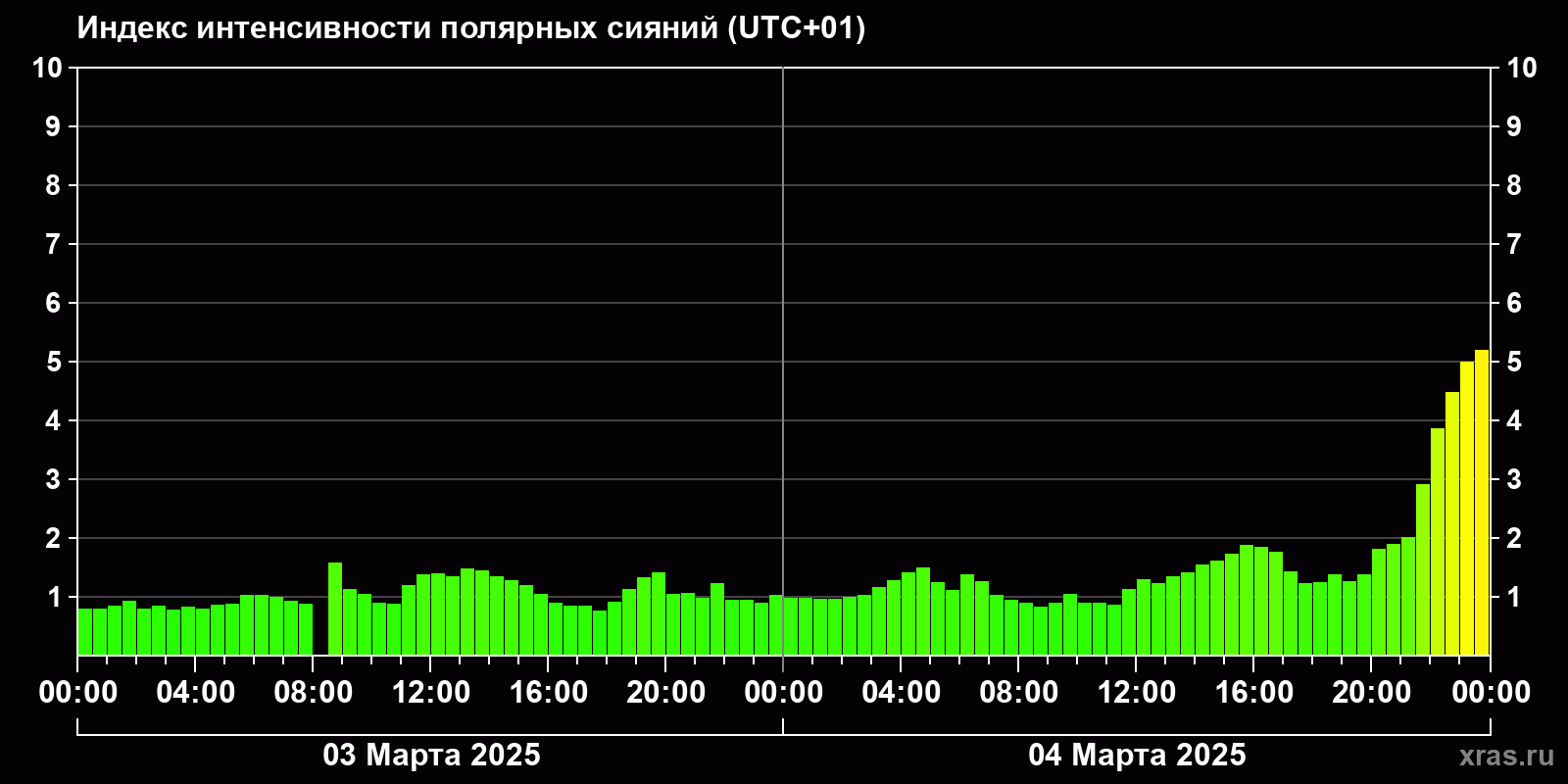Изменения индекса интенсивности полярных сияний с 2025-03-03 по 2025-03-04 по местному времени