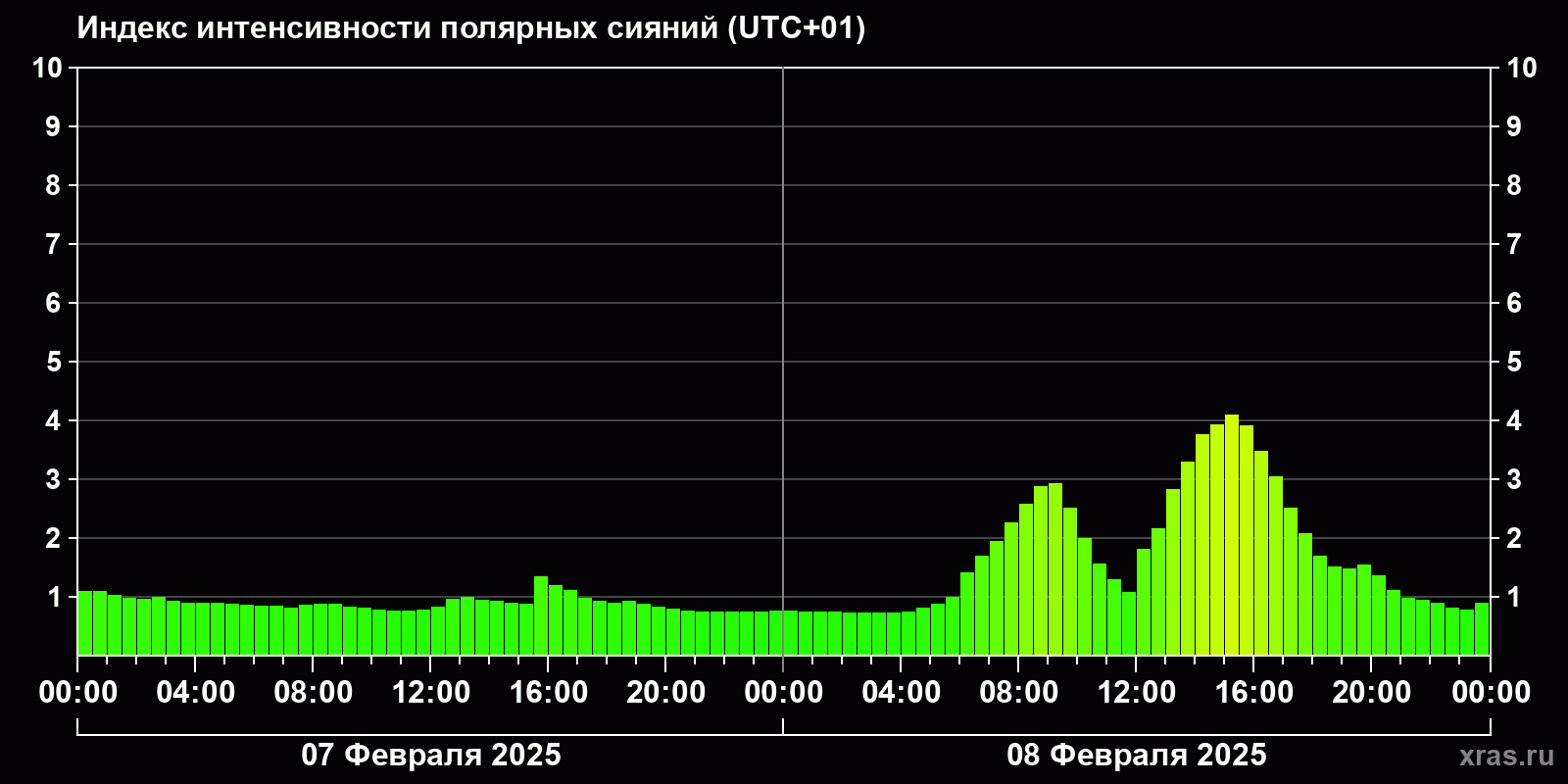 Изменения индекса интенсивности полярных сияний с 2025-02-07 по 2025-02-08 по местному времени