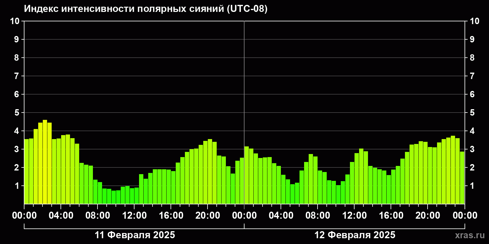 Изменения индекса интенсивности полярных сияний с 2025-02-11 по 2025-02-12 по местному времени