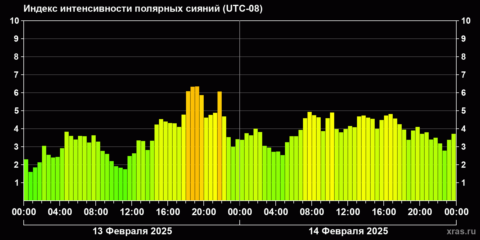 Изменения индекса интенсивности полярных сияний с 2025-02-13 по 2025-02-14 по местному времени