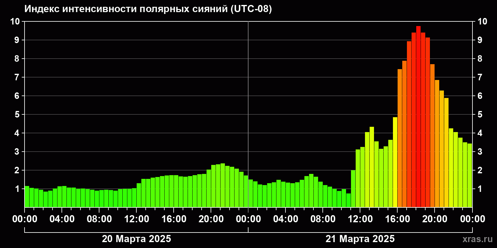 Изменения индекса интенсивности полярных сияний с 2025-03-20 по 2025-03-21 по местному времени