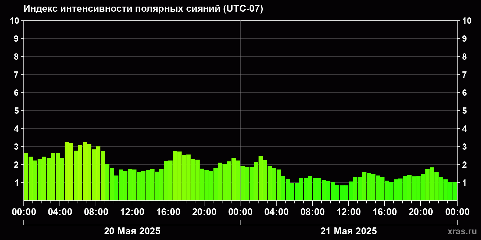 Изменения индекса интенсивности полярных сияний с 2025-05-20 по 2025-05-21 по местному времени