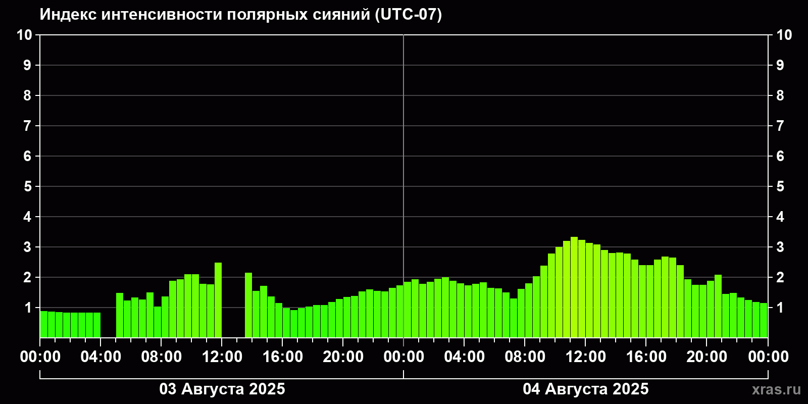 Изменения индекса интенсивности полярных сияний с 2025-08-03 по 2025-08-04 по местному времени